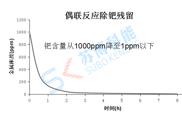加入寧波蘇博科能吸附材料,在酸性條件下攪拌4h將鈀離子的殘留量降低到5ppm以下,8小時降低到1ppm以下,十分高效。