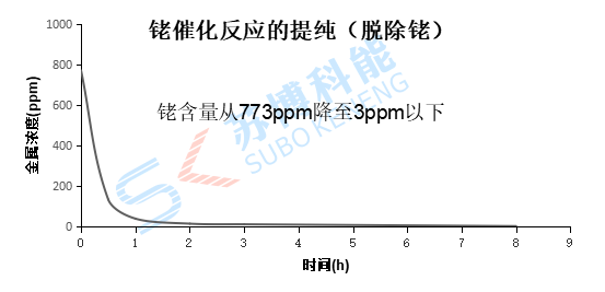 銠催化反應(yīng)的提純(脫除銠) 初始濃度為773ppm含銠離子溶液,在加入寧波蘇博科能吸附材料攪拌8h后,能將銠含量控制到3ppm以下,隨著操作時間的增加,還能將銠含量控制到更低。